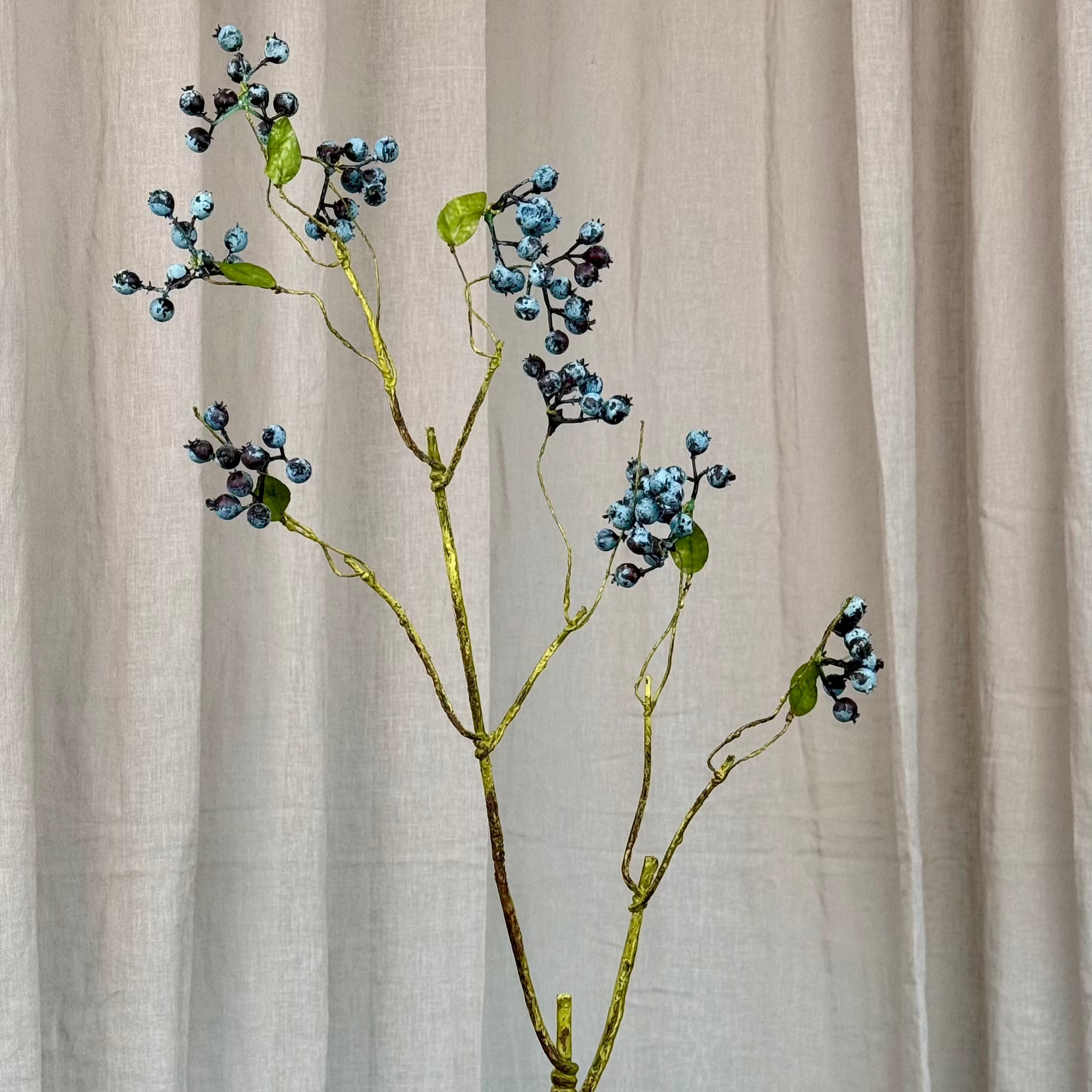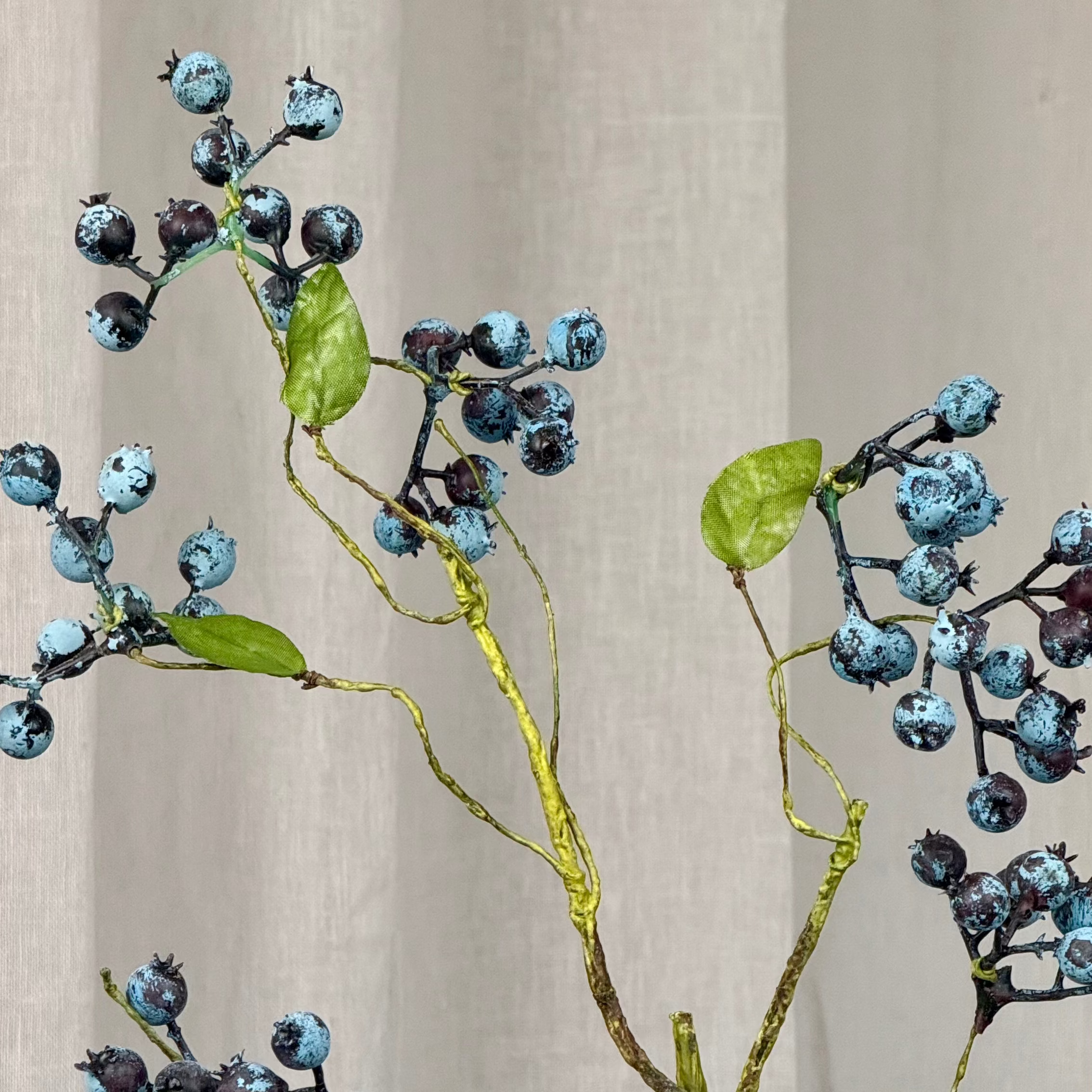 This Large Blueberry Branch features small, matte berries in nuanced shades of blue, ranging from dusty pale tones to deeper, muted hues. The delicate clusters of berries are naturally arranged on thin, gently twisting branches with a subtly weathered finish. All branches are adjustable, allowing easy shaping and positioning. Sparse green leaves appear along the branches, adding discreet contrast to the varied blue tones.