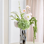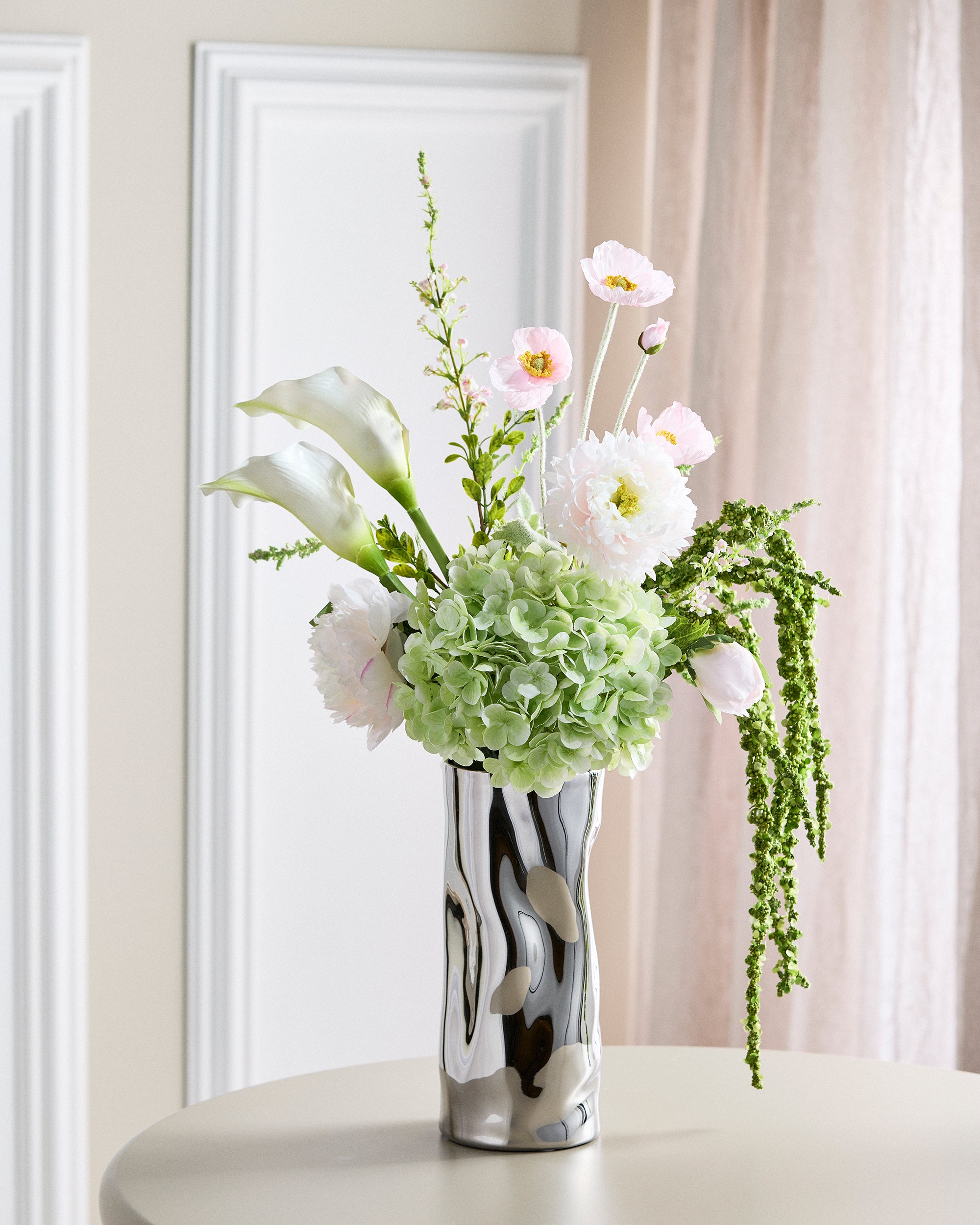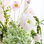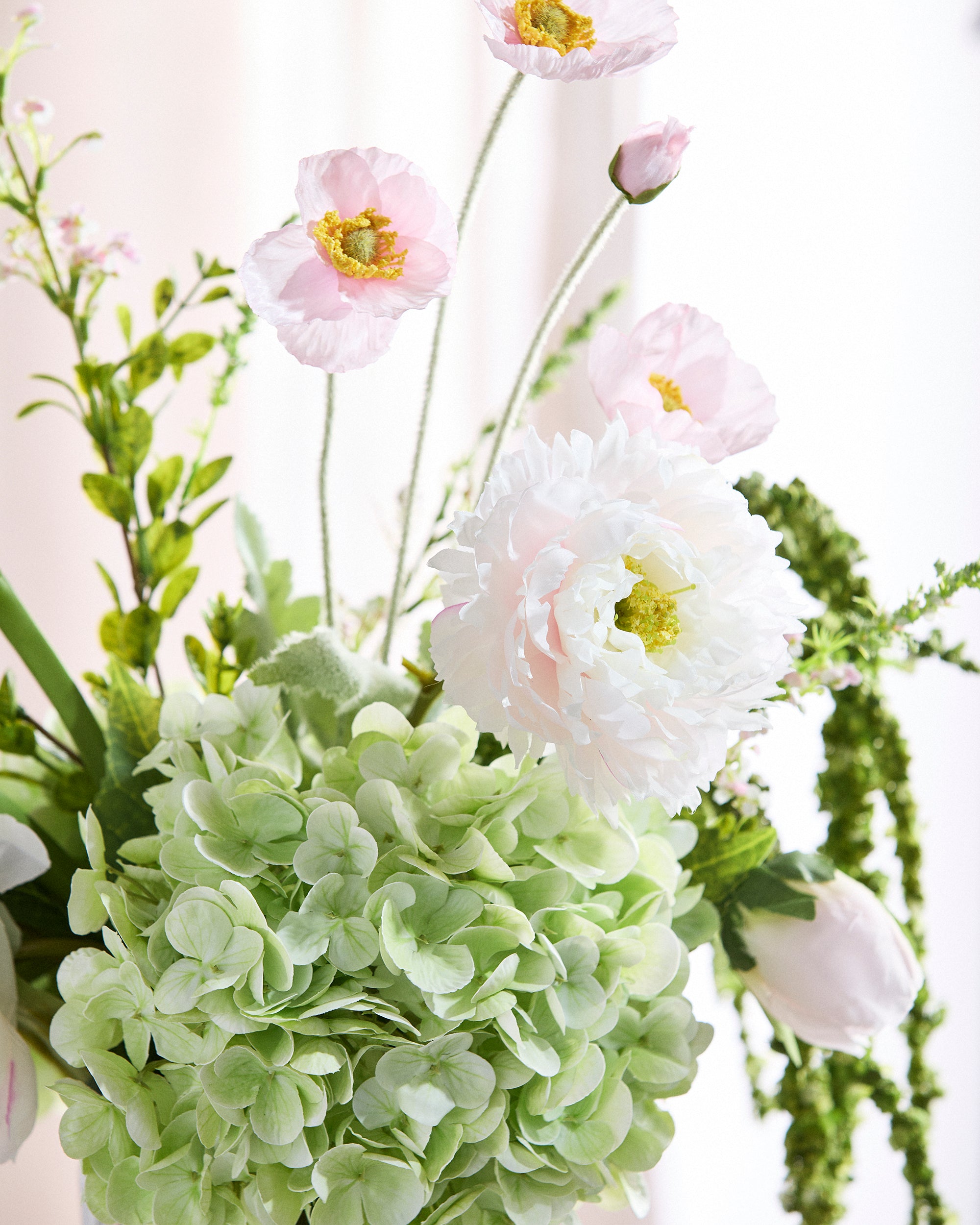 The "Bubblegum Bliss" bouquet is a charming arrangement of lifelike artificial flowers, inspired by the playful and sweet essence of bubblegum, with its delicate soft pink and minty green colors. This delightful bouquet features light pink peonies, bringing a touch of romance and lushness with their layered petals. Light green hydrangeas add a fresh and airy base, perfectly complementing the bouquet's overall color palette. Elegant calla lilies introduce a refined element to the design, while light pink salvia adds texture and a whimsical touch. Cascading amaranthus brings a sense of movement, and a mix of pink and light pink poppy flowers adds a cheerful, vibrant accent. The "Bubblegum Bliss" bouquet beautifully captures the fun and lighthearted spirit of its namesake, making it a delightful addition to any setting.
