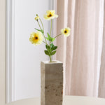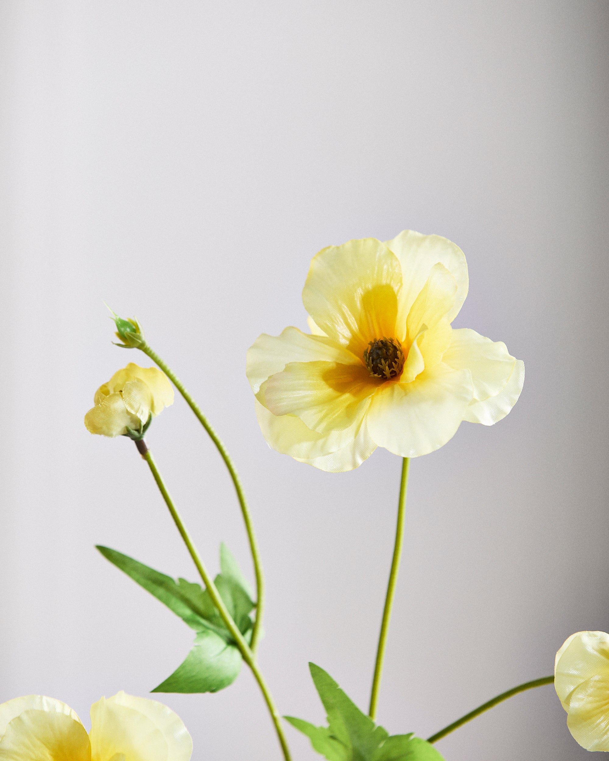 This delicate Butterfly Ranunculus flower appears slender and graceful. The stem consists of five flowers: two fully bloomed flowers, one partially bloomed flower, one nearly-bloomed flower, and a bud. The flowers are made of silk to give them their graceful appearance.