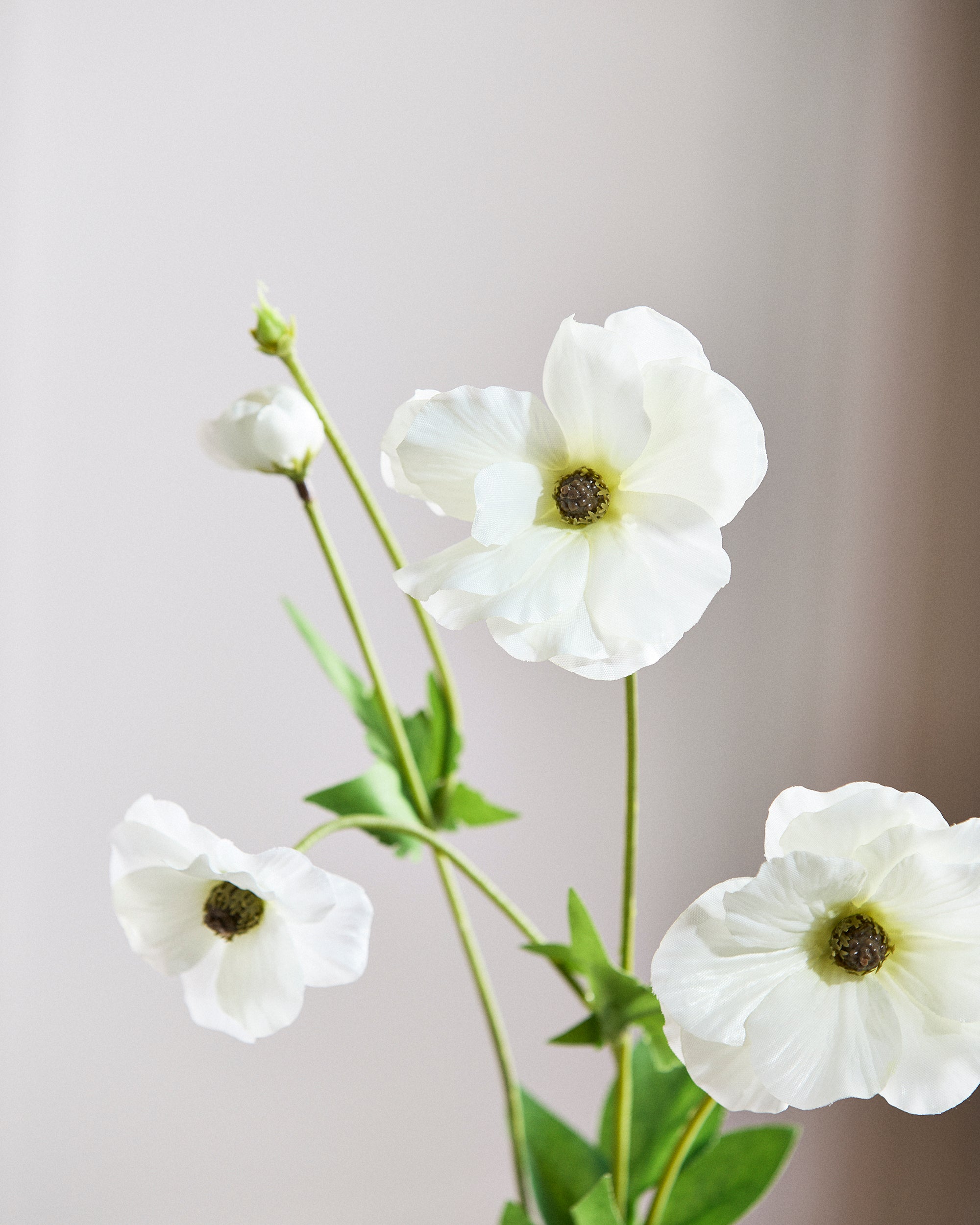 This delicate Butterfly Ranunculus flower appears slender and graceful. The stem consists of five flowers: two fully bloomed flowers, one partially bloomed flower, one nearly-bloomed flower, and a bud. The flowers are made of silk to give them their graceful appearance.