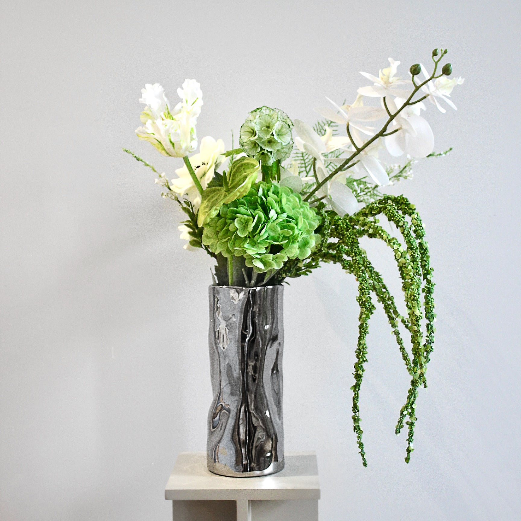 Adding to the lush greenery are the voluminous green hydrangeas and anthurium, their vibrant foliage imbuing the arrangement with a sense of vitality and freshness. The delicate white anemone and salvia flowers provide a subtle contrast, while the cascading amaranthus and fern leaves add a touch of whimsy and movement.