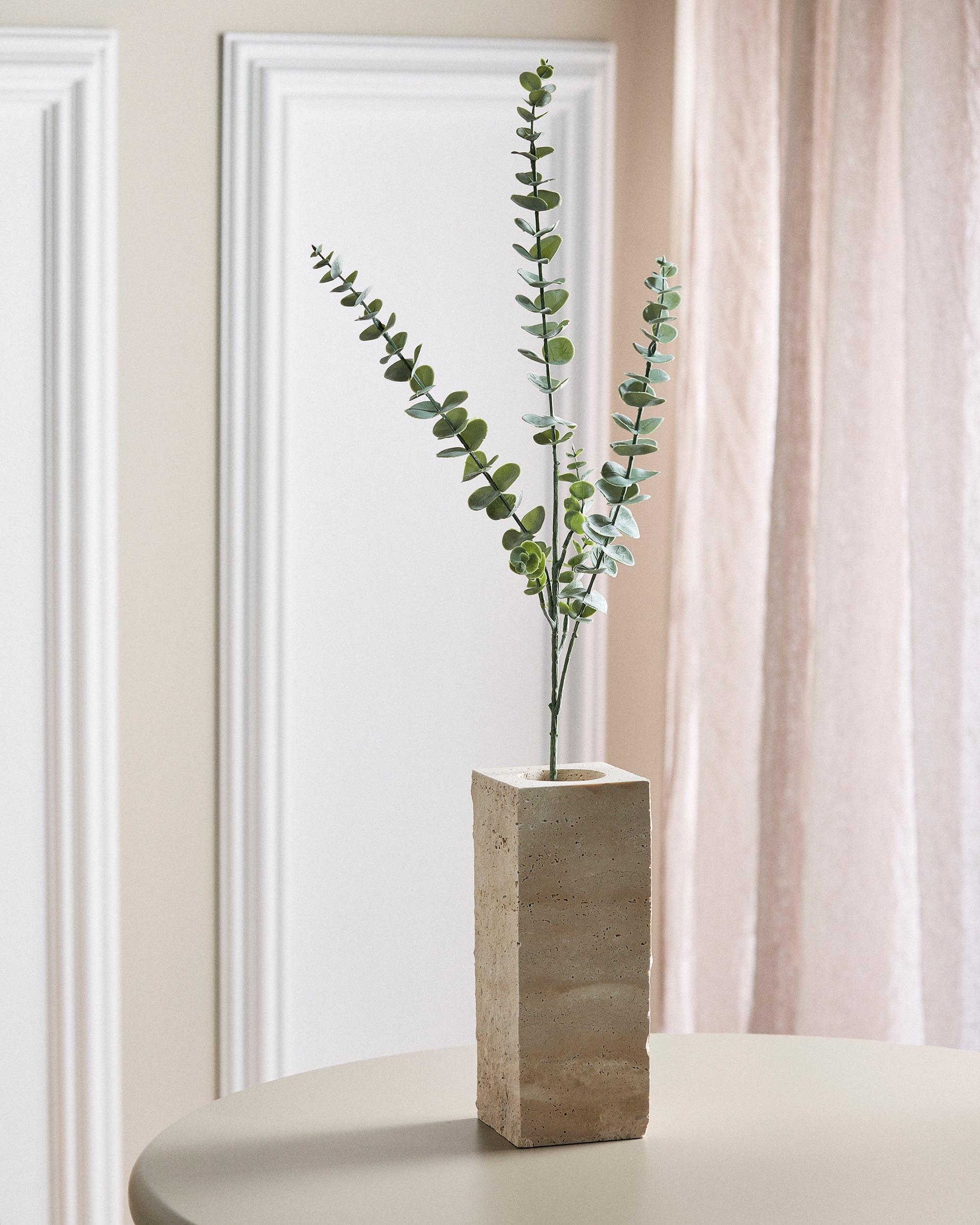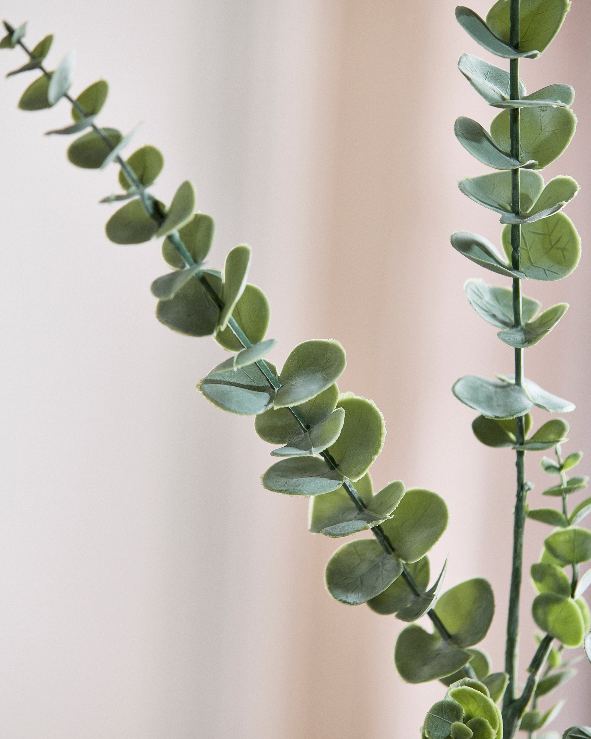 Hver gren er håndlavet med runde, sølvgrønne blade i blød latex og plastik, der fanger eukalyptusens karakteristiske form og farve. De fine nuancer og subtile variationer i bladene giver et realistisk og stilrent udtryk, der passer perfekt til både minimalistiske og frodige dekorationer.