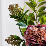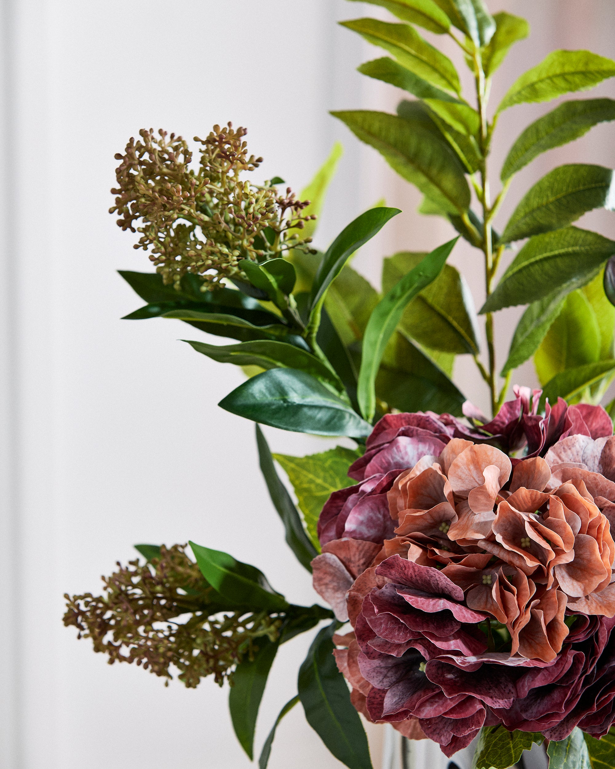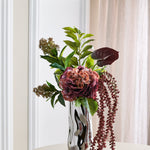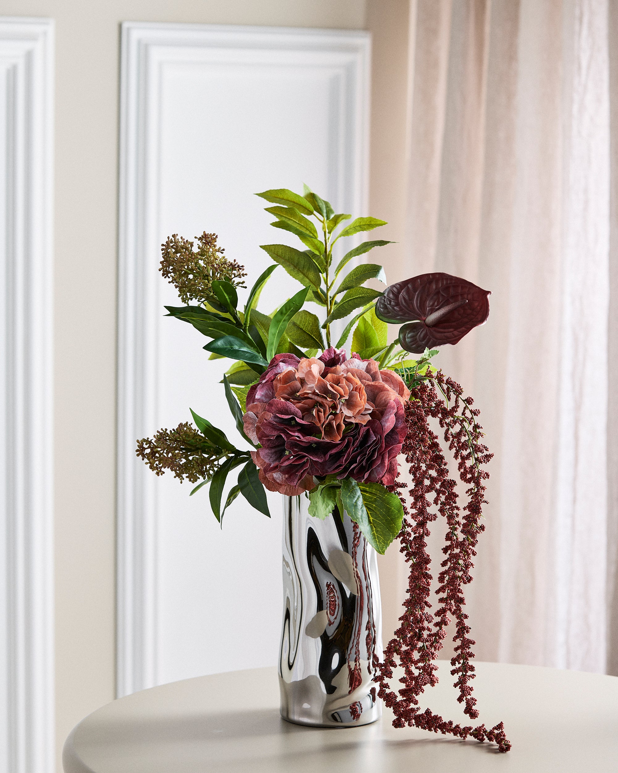 Falling for Fall is a deep and dramatic bouquet with dark red hydrangeas and anthuriums, highlighted by balanced green elements. Perfect for you who want a modern, edgy bouquet that makes a bold and confident statement in your home.