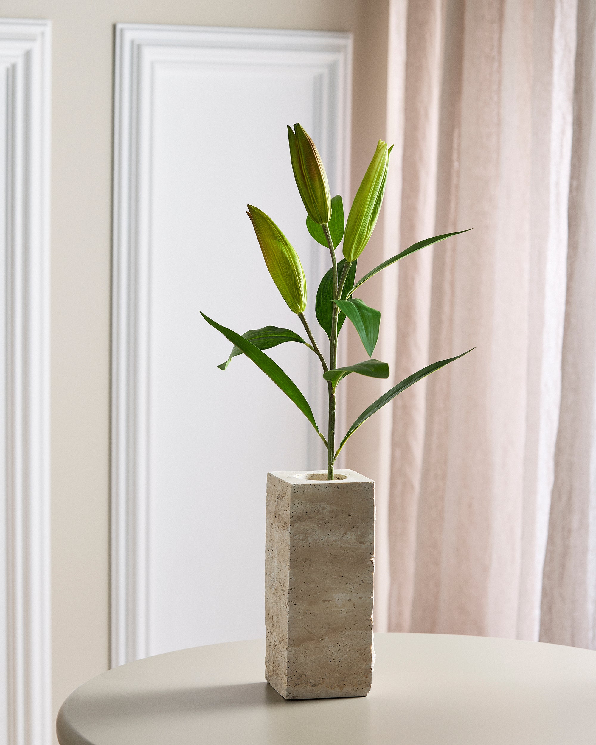 Standing at 95 cm tall, this artificial lily features a plastic stem reinforced with an iron wire core, allowing for easy trimming and flexible positioning to suit your decorative needs. Each stem includes three green flower buds, providing a fresh and natural look.