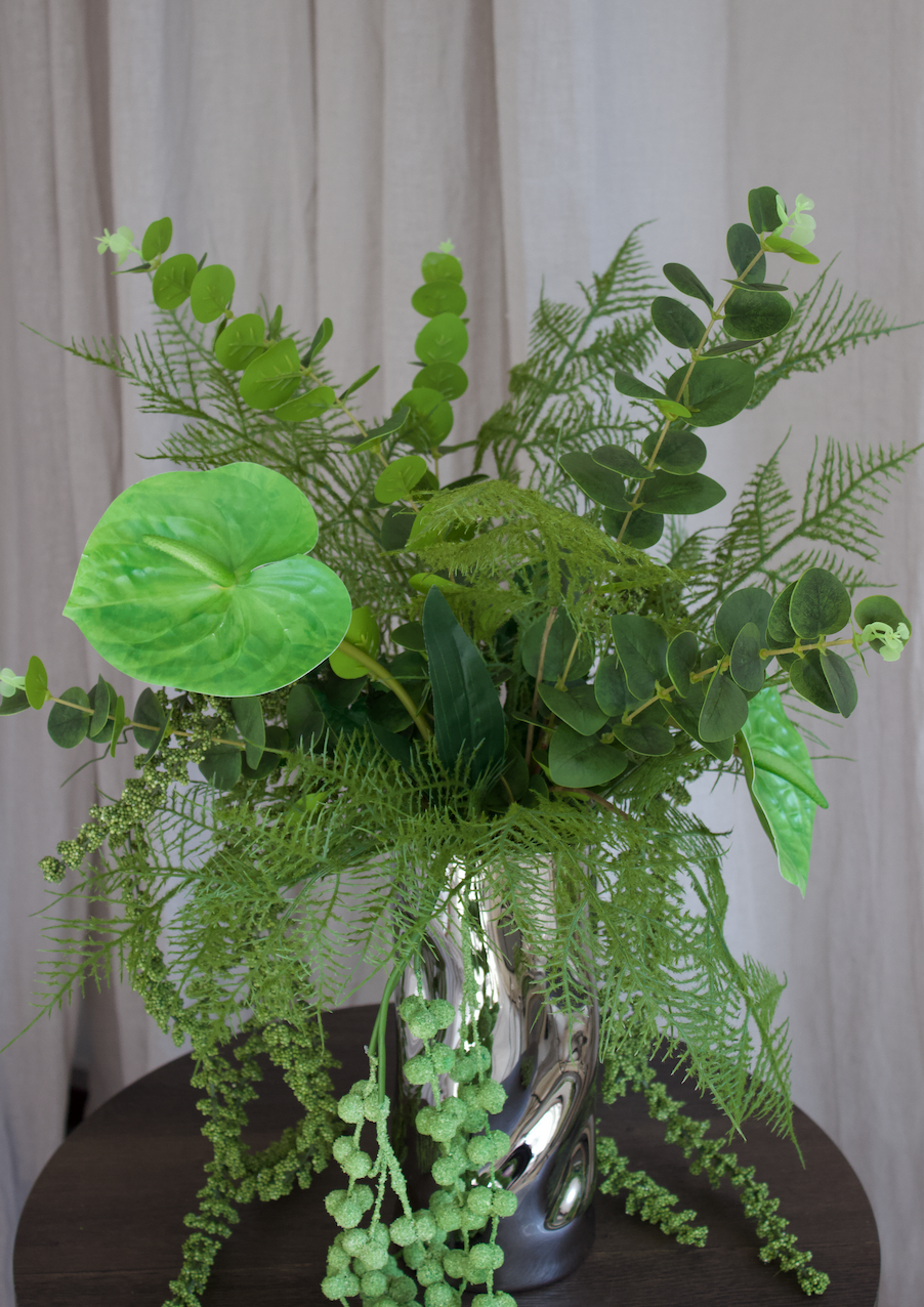 Hidden Forest is a lush, sculptural bouquet in layered shades of deep forest green. Ferns, eucalyptus and glossy tropical leaves bring calm, depth and movement, while the cascading greens spill gently over the rim—like a hidden woodland captured for your space. Perfect for those who want a pure green statement with natural elegance and attention to detail.