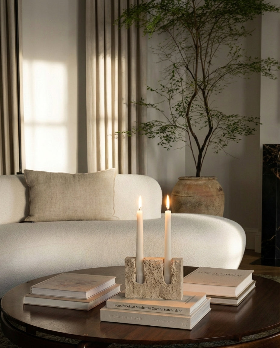The Luma Travertine Candle Holder works beautifully on a dining table, coffee table, or shelf — on its own or styled alongside other natural materials.