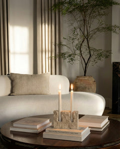 Crafted to complement the candle holder's refined yet raw expression, the candles feature a simple, timeless design that blends seamlessly into both modern and classic interiors. Their minimalist appearance allows the natural beauty of the travertine to remain the focal point.