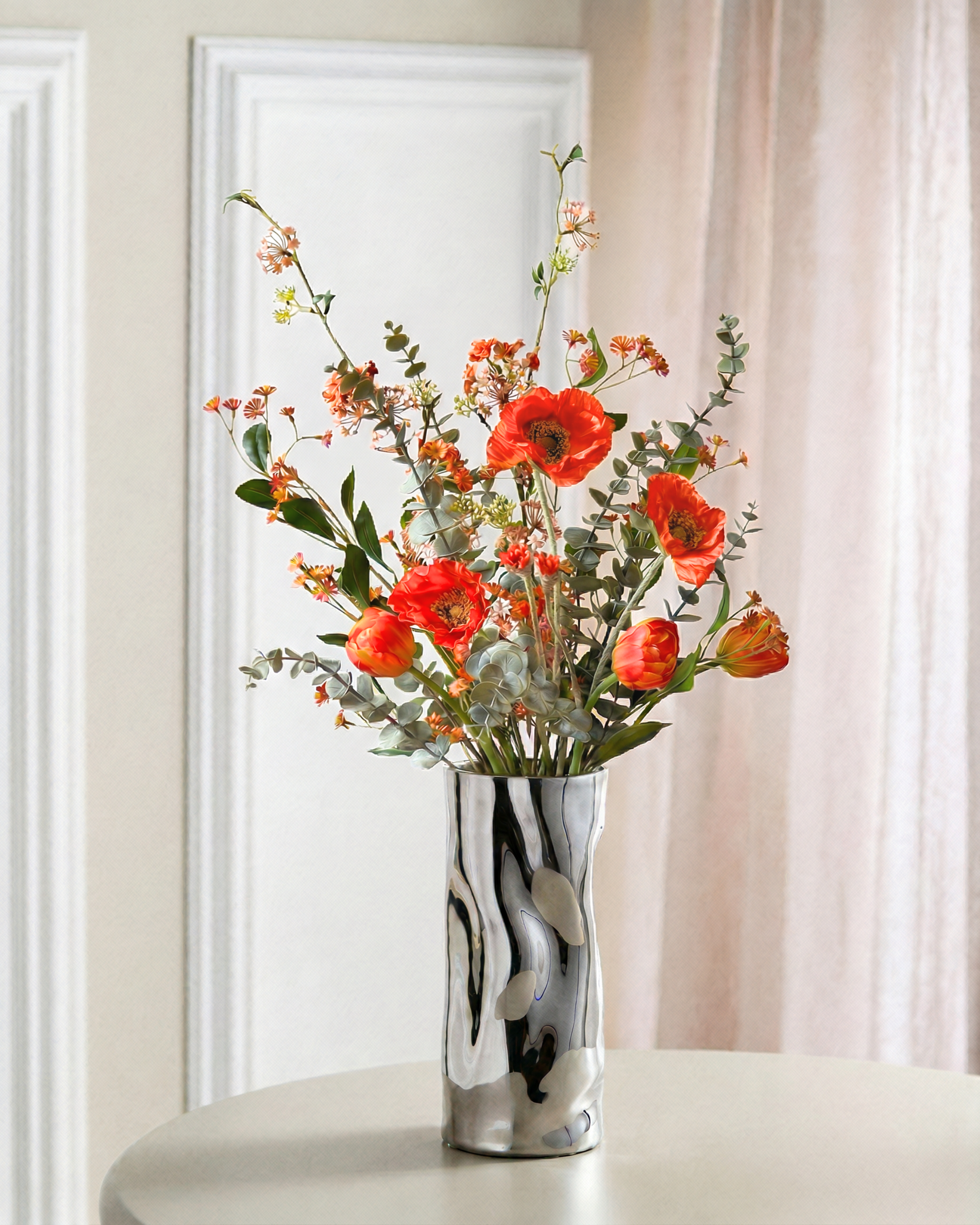 Inspired by sunlit fields of wildflowers: Orange Wildflower Bouquet brings together vibrant orange poppies, warm-toned tulips and airy greenery in a bouquet that feels warm, bright, and full of life.