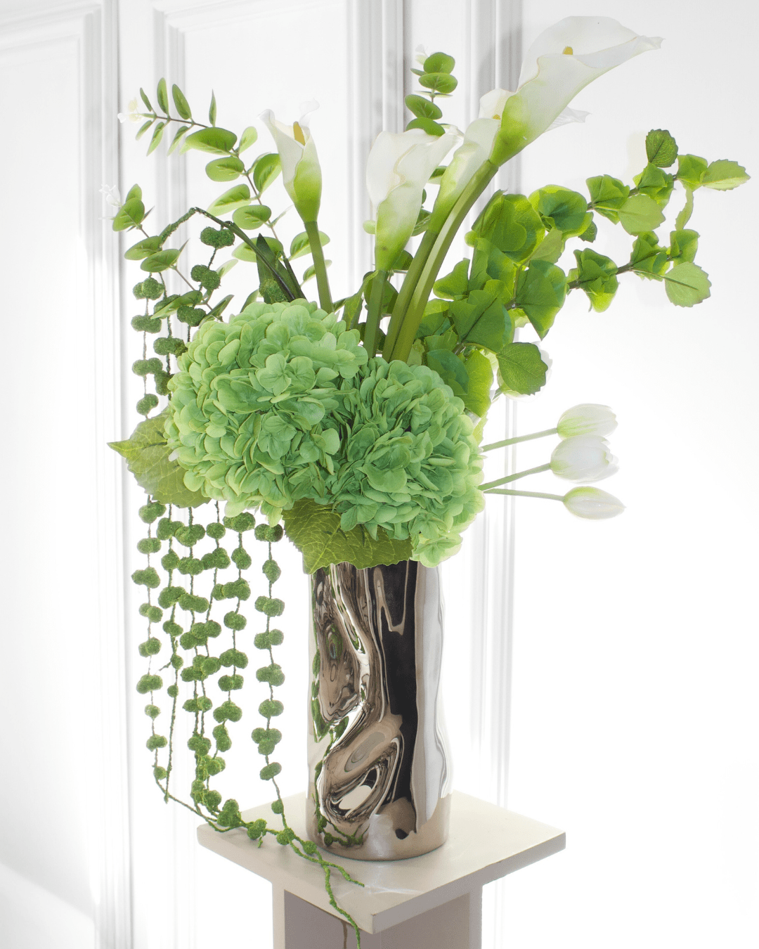 The "Pistachio Dream" bouquet is an elegant arrangement of lifelike artificial flowers that exudes a fresh and modern charm. It features a harmonious blend of soft greens and whites, with a focus on natural textures and forms. The bouquet is composed of graceful white calla lilies, which add a touch of sophistication, and cascading "lover's tear" amaranthus that brings movement and a whimsical element to the design. The vibrant green hydrangea blossoms provide a lush, full-bodied centerpiece, complemented by the delicate structure of bell of Ireland flowers. The eucalyptus stems introduce a hint of silvery-green foliage, enhancing the bouquet's overall freshness. Additionally, two small clusters of white tulips add a subtle, yet refined accent, rounding out this stunning arrangement.