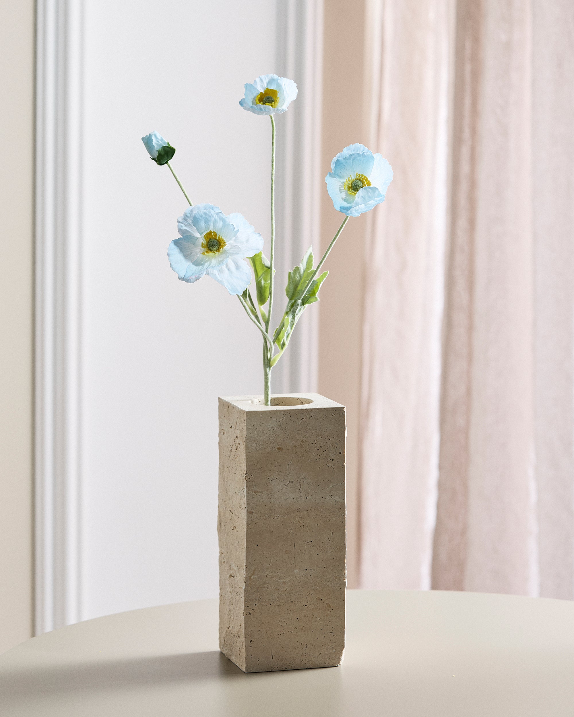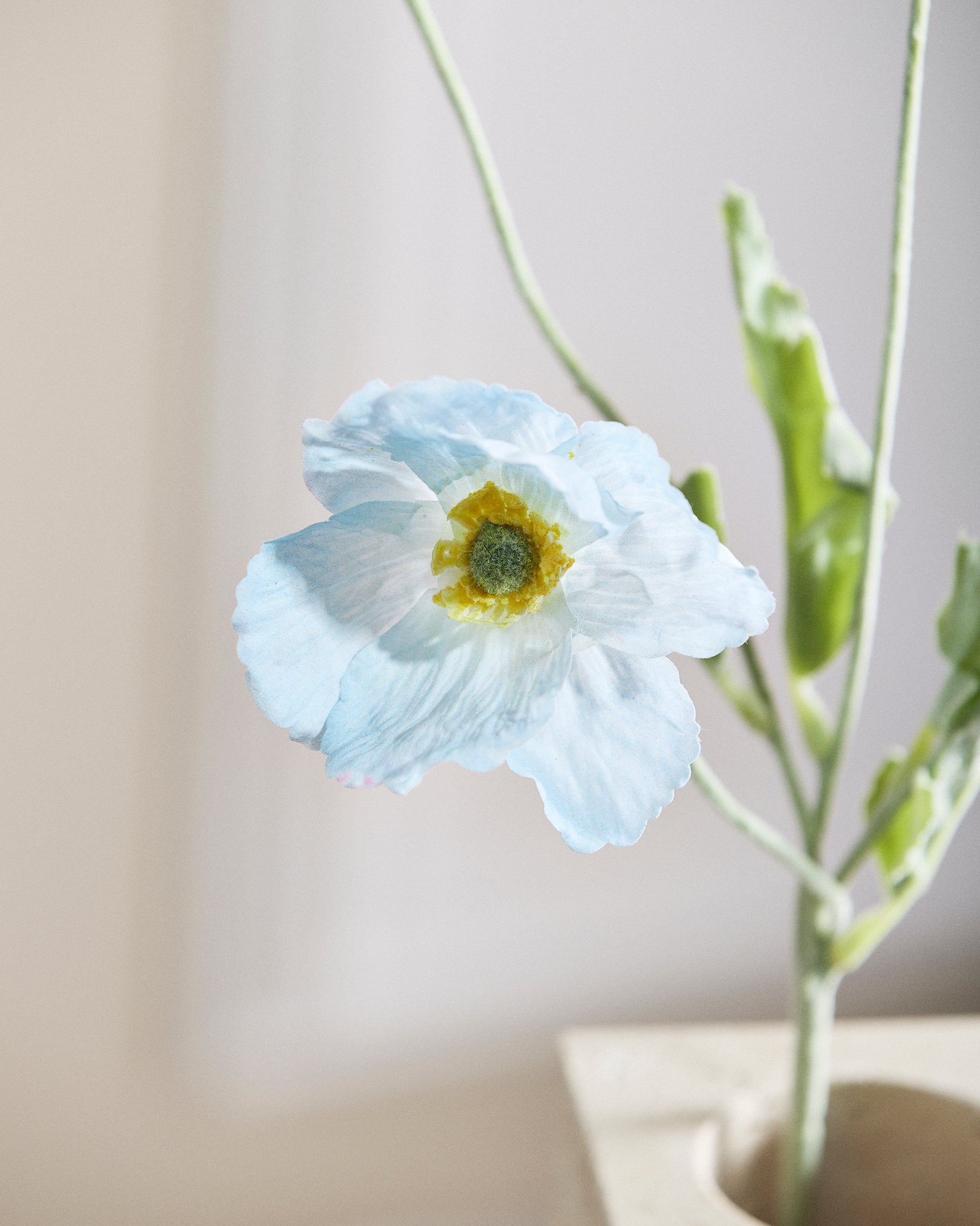 A butter yellow poppy flower with soft, muted silk petals – latex-coated for a lifelike, real touch feel. The petals have a matte finish and a cool, natural texture, just like a freshly picked flower. Beautiful on its own or paired with complementary tones.