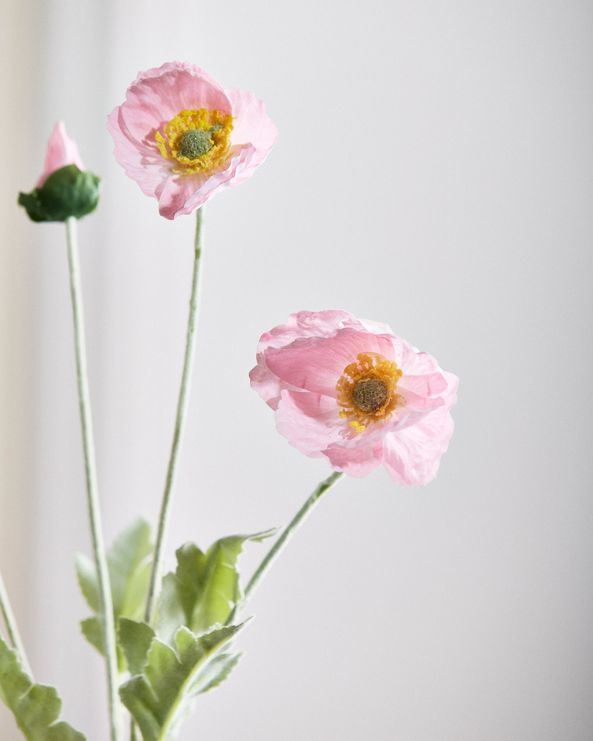 A butter yellow poppy flower with soft, muted silk petals – latex-coated for a lifelike, real touch feel. The petals have a matte finish and a cool, natural texture, just like a freshly picked flower. Beautiful on its own or paired with complementary tones.