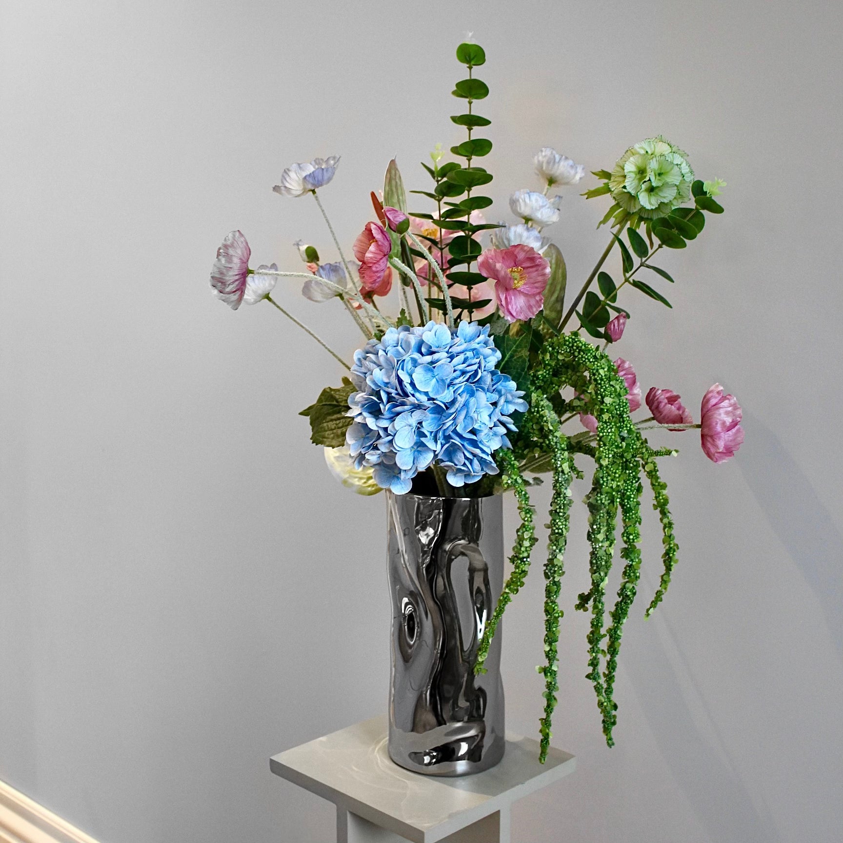At the heart of this enchanting bouquet are the elegant white and pink with a hint of green anthuriums, their delicate petals imbued with soft hues reminiscent of a blush rosé. Complementing these blooms are the vibrant light pink, blue, and pink poppy flowers, their cheerful colors adding a playful touch to the arrangement.