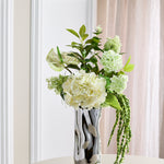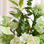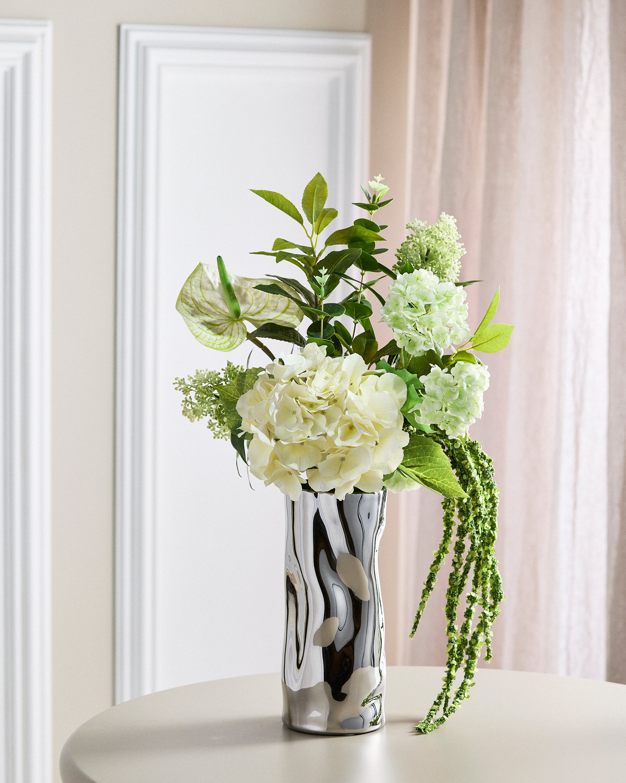 A modern and elegant composition in light green and creamy white shades. The full hydrangea, the light anthurium and the drooping amaranthus create a lush, yet still calm expression.