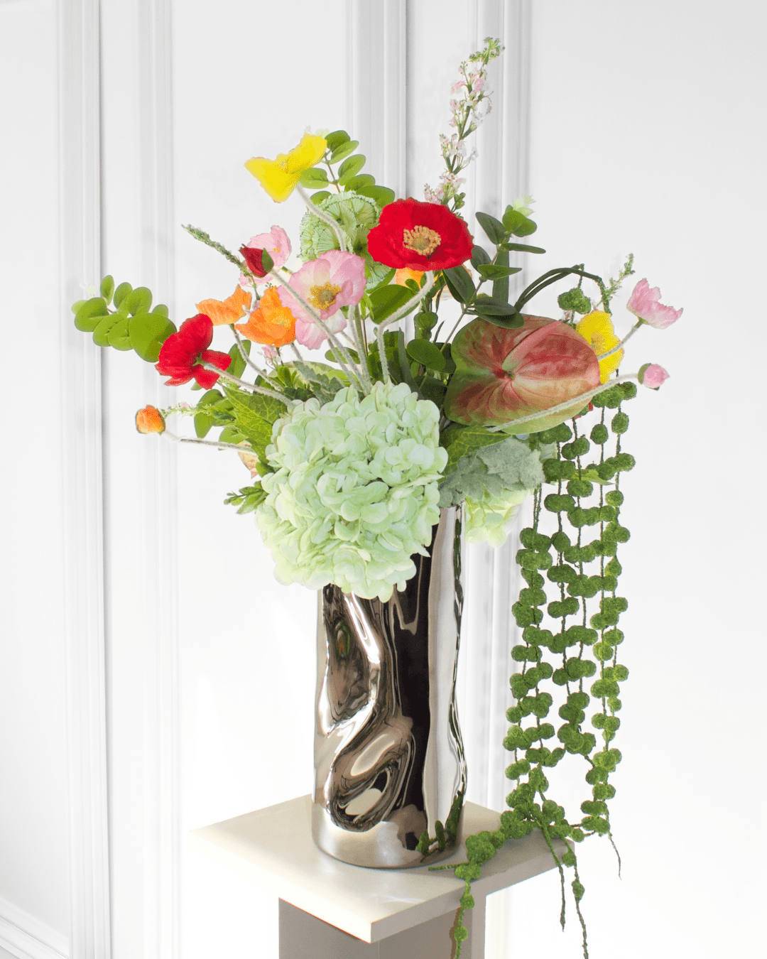 The "Tropical Juice" bouquet is a vibrant explosion of color, inspired by the refreshing mix of citrus and tropical fruits. This lively arrangement features a variety of colorful poppy flowers, bringing a burst of energy to the design. Eucalyptus adds a fresh, green touch, while pink anthuriums introduce a bold, exotic flair. The cascading lover's tears amaranthus adds dynamic movement, complemented by the delicate beauty of scabiosa and the soft, airy texture of light pink salvia. Together, these elements create a dazzling and cheerful bouquet that captures the essence of a tropical paradise in full bloom.
