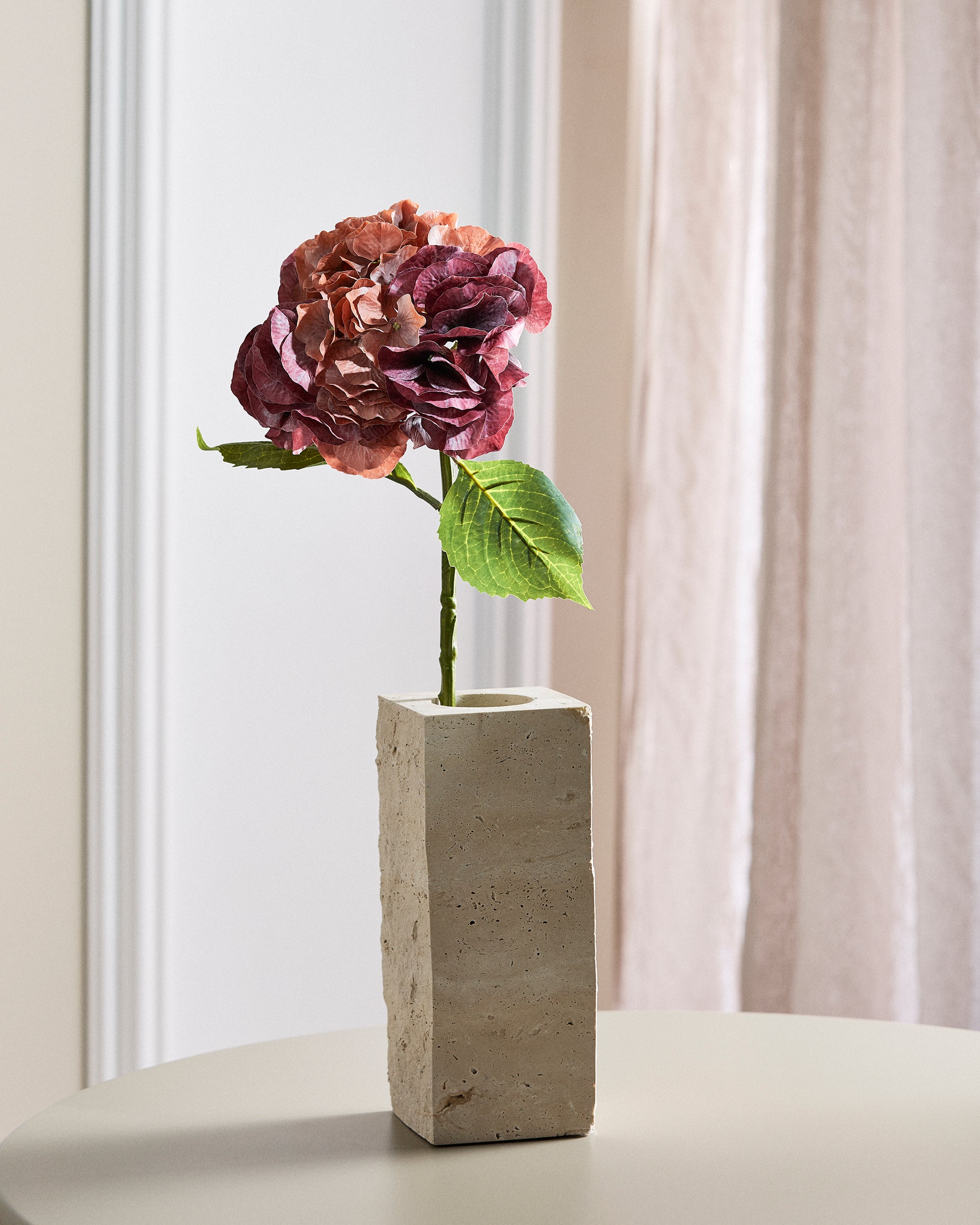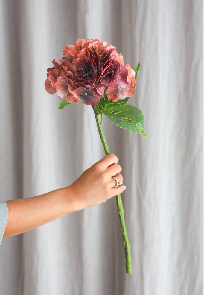 More lifelike than ever the Artificial Latex Vintage Large Hydrangea is a meticulously crafted faux flower that captures the timeless beauty of real hydrangeas. Standing at 50 cm tall, it features a single bloom made from high-quality latex, providing a realistic texture and appearance. The plastic stem is reinforced with an iron wire core.